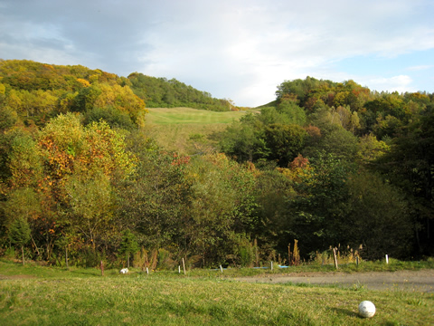 というのも、ドライバーショットは半分以上がOBギリギリ。グニーっと右へ曲がっていくものの傾斜でバウンドしてフェアウェイに戻ってきたり、カート道の脇でボールが止まっていたり、崖下にボールが落ちたけどもOB杭のところギリギリに落ちていたりと、一歩間違えばOBラッシュな感じ…∑(゜Д゜;)